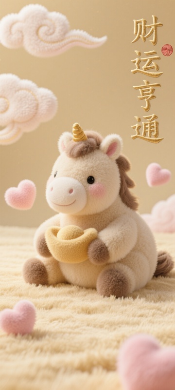 毛绒质感发财壁纸,背景为暖粉色渐变,主体是柔软毛绒独角兽背着一个大金元宝,周围散落毛绒福袋和迷你毛绒铜钱,整体氛围可爱喜庆,细节丰富。