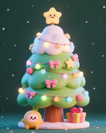 软3D风格的拟人雪人拥抱粉色圣诞树,搭配梦幻星光,传递可爱、温馨与喜庆的节日氛围。