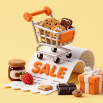 印着“SALE”的黄色购物车,放在巨大的购物小票上,装着饮料、薯片、饼干,红色礼盒,背景为粉色