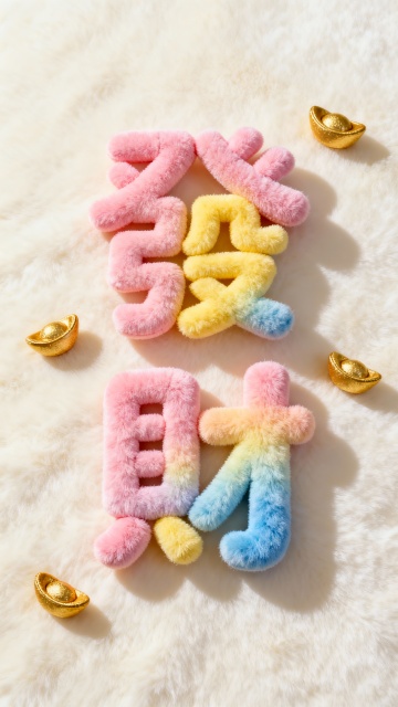 直接以“发财”为主题,用更现代可爱的圆体字,结合彩虹毛绒质感,让财富寓意变得活泼又甜蜜。