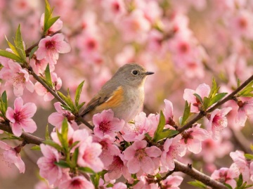 明媚阳光下绽放的粉色樱花特写,娇嫩花瓣呈现柔和渐变,花蕊点缀着淡黄色,纤细的棕色枝干支撑着繁茂的花朵,背景是纯净的浅蓝色天空,整体画面采用明亮通透的自然光,浅景深效果使前景樱花清晰锐利而背景逐渐柔和模糊,色调以粉白为主、蓝为点缀,营造出清新、浪漫、充满春日气息的氛围,高饱和度与柔和对比度展现出樱花的娇嫩质感与生机盎然。