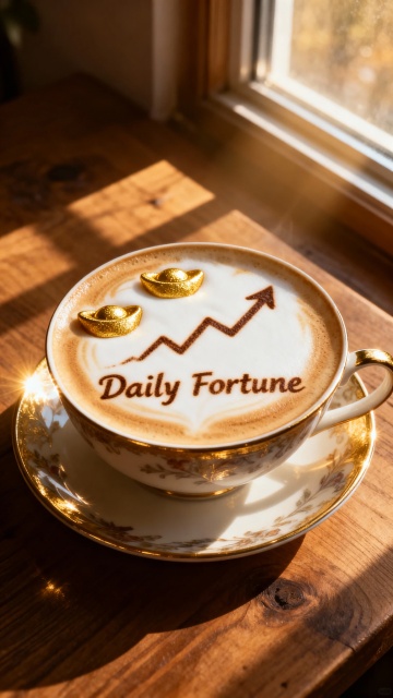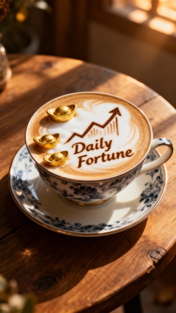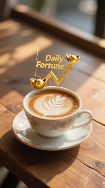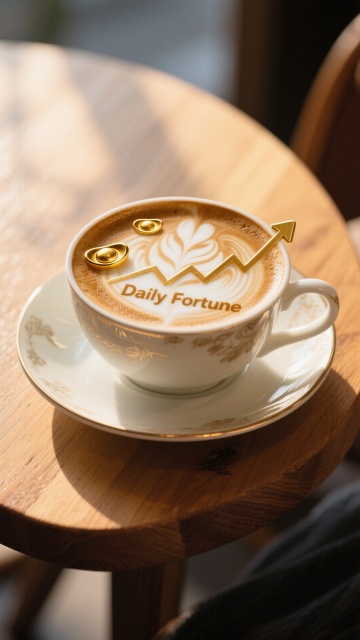 概念艺术,一杯拿铁咖啡,其奶泡上有一个复杂而完美的金元宝和上升趋势图的拉花。咖啡放在木质桌子上的精美瓷杯中。暖冬晨光。“Daily Fortune”字样被巧妙地融入其中。超现实主义,细节丰富,暖色调。