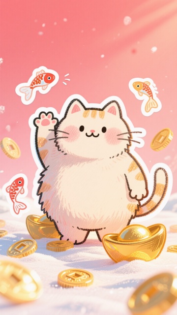 可爱卡通猫拟人化,毛发生长细腻,鎏金元宝与锦鲤环绕,插画风喜庆贺岁。