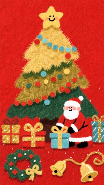 喜庆红底圣诞插画,卡通拟人圣诞树与笑脸星星,刺绣质感礼物与铃铛,童趣温馨节日氛围。