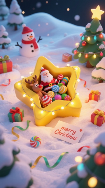 软3D粘土风格圣诞场景,卡通感十足的圣诞老人与装饰树,搭配悬挂雪花与星光,营造梦幻温馨的节日氛围。