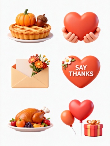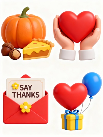3D立体字设计,"感恩节快乐"五个大字采用橙黄色渐变立体效果,边缘有白色高光勾勒,字体饱满圆润,带有节日的欢快感。文字周围点缀红色爱心和橙色、黄色的鲜花装饰,爱心大小不一,鲜花形态自然,增添温馨浪漫氛围。下方横幅保留"Happy Thanksgiving Day"英文,字体为无衬线体,颜色与中文相协调,横幅两端装饰小巧的橙色南瓜图案,整体画面充满感恩节的温暖、感恩与庆祝氛围,视觉层次分明,色彩明快和谐,信息传达清晰,符合节日海报的设计感。