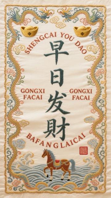 一幅富丽堂皇的吉祥刺绣,以米白色绒布为底,运用多层叠绣工艺。主色采用喜庆的珊瑚红、富贵的琥珀金与典雅的宝蓝色,间以月光白点缀。画面中心是挺拔秀美的"禄"字,采用盘银绣法,字内暗绣双鹿戏春图,边缘以宝蓝色丝线勾勒出祥云纹。四周环绕开屏孔雀与绽放牡丹,孔雀尾羽采用七彩丝线,牡丹以珊瑚红丝线绣出层叠花瓣。中英文祝词"May success accompany your journey"与"HONOR AND GLORY"选用古典衬线体,错落有致。边角饰以连珠纹与方胜纹,配以珊瑚红官印形印章,内刻"进禄"篆书。