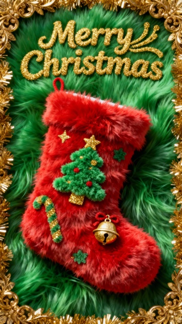 复古鎏金边框环绕,毛绒圣诞袜搭配刺绣风装饰,融合重拟物与毛发生长质感,营造喜庆温馨的卡通圣诞氛围。