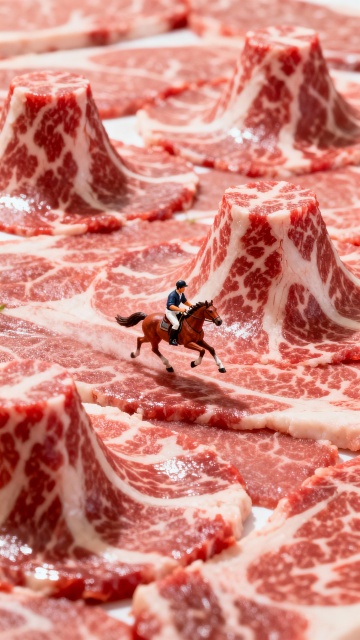 一大片雪花牛肉做成的地面,有突起的雪花牛肉做的小山坡,一个人骑马在地面上