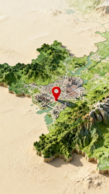 湖南省地形图,红色定位标记位于各地级市位置,地形图显示绿色植被覆盖,背景是柔和的浅色,C4D,OC渲染,细腻的光影效果,细节丰富。