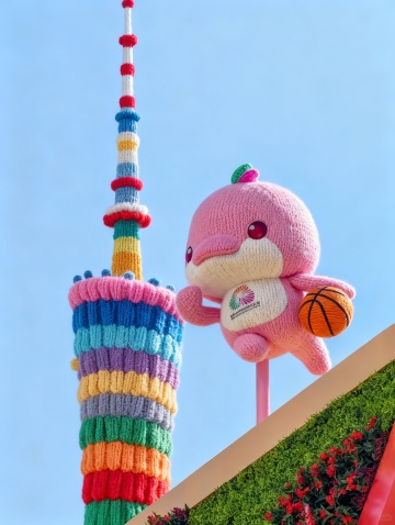 毛发生长风与软3D结合,拟人化粉色小海豚手持篮球,萌趣十足,搭配彩虹针织塔,营造梦幻清新感,卡通风格尽显可爱与趣味。