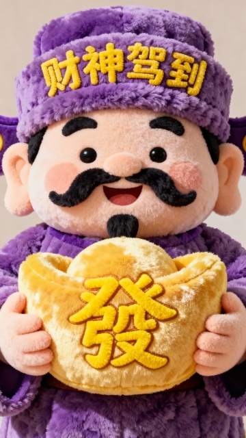 红色色泰迪绒财神捧出的巨大毛绒金币上,用亮黄色的绒线绣着一个大大的“發”字。他帽子的帽檐上,也滚着一圈绣有“财神驾到”的字样。