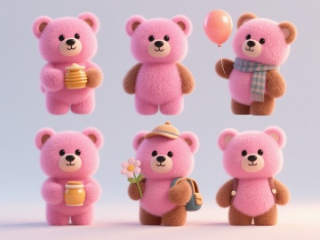 一系列6个完全不同内容的棕色毛绒小熊玩偶,保持相同的3D超写实风格,每个小熊都有蓬松柔软的棕色毛发质感,圆润的耳朵,黑色大眼睛和黑色小鼻子,纯色背景,规整排布,每个小熊的姿态和手持物品各不相同,有的抱着蜂蜜罐,有的戴着小帽子,有的拿着小花,有的背着小书包,有的戴着围巾,有的举着气球,整体画面充满可爱温馨的氛围,细节精致,光影柔和,立体感强。