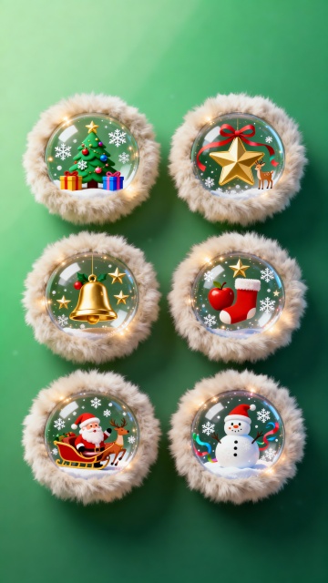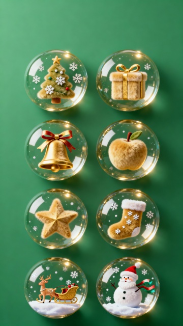 一套圣诞系列素材集合。第一个图标(圣诞树,雪花,礼盒);第二个图标(五角星,丝带,小鹿);第三个图标(铃铛,苹果,星星);第四个图标(五角星,袜子,雪花);第五个图标(驾着鹿车的圣诞老人,雪花点缀);第六个图标(带着圣诞帽的雪人,飘逸的雪花,彩带)等组合、生成6个圆圆的水金球里是毛绒冬日立体风格图标,图标光感强烈,图标有蓬松热软的绒毛感,6个图标元素之间比例协调,三行两列布局整齐排列,元素和元素之间空隙相等。整体渐变绿色背景