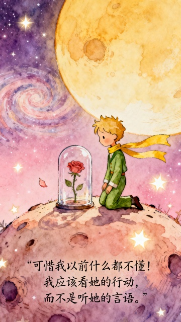 全景,小王子站在一个漂浮的星球上,身处一片盛开着的、成千上万朵一模一样的玫瑰花丛中。他没有悲伤,而是面带温柔的微笑,目光深邃地望向画外,仿佛在与观众对话。一束天光单独照亮了他和他心中那朵独一无二的玫瑰所在的位置(那里空无一物,象征着玫瑰在他心中)。周围无数的玫瑰均微微失焦。背景是梦幻的、繁星点点的夜空。画风:强烈的诗意对比,中心聚焦,温暖人心的结局。字幕内容:“我的玫瑰是独一无二的。”核心基调为:圣埃克苏佩里《小王子》原著手绘风格,淡彩水粉质感,柔和细腻的线条,略带复古的童话书页纹理。主色调为梦幻的粉紫色星空,点缀着明亮而温柔的星辰,营造出诗意且哲思的氛围。