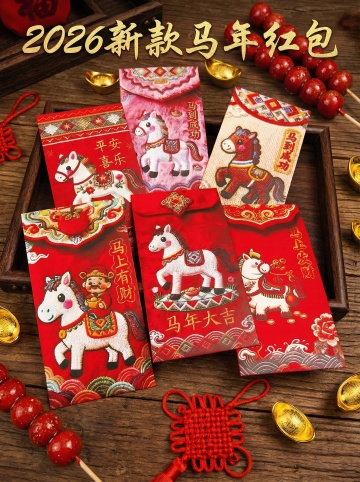 喜庆插画风,卡通摇马与大字“马上有钱”结合描边剪纸元素,点缀烟花爱心,传递新年可爱祝福。