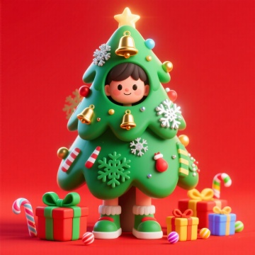 圣诞树拟人形象,萌趣可爱,搭配节日礼物与糖果,喜庆卡通感十足。