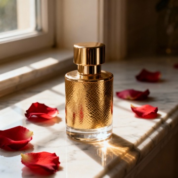 鎏金瓶身雕琢细腻纹理,映衬玫瑰花瓣与光影交错,融合欧洲宫廷艺术与重拟物风,尽显奢华优雅与浪漫气息。