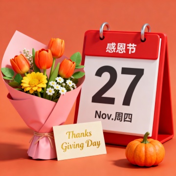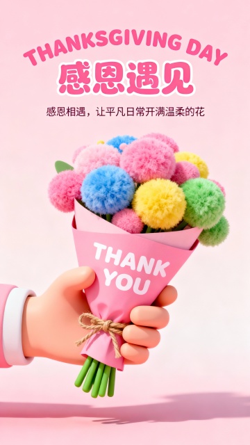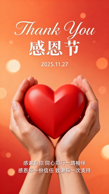 温馨感恩主题海报,柔和渐变粉色到淡橙色背景营造温暖治愈氛围,画面中心偏上位置为醒目的黑色毛笔书法字体“感恩有你 一路相伴”,字体大气飘逸富有浓厚人文气息,其下方居中排列黑色小字“感恩节”、英文“THANKS GIVING DAY”及日期“11/28”形成清晰信息层级,海报下半部分是由半透明粉色丝带巧妙缠绕形成的立体心形图案,丝带边缘带有柔和高光增添画面层次感与浪漫质感,心形图案内部中央用潇洒的红色手写体英文书写“Thank you.”,字体灵动自然,海报底部为黑色小字“感恩有你 同心同行”,整体采用垂直对称构图,视觉焦点突出,色彩和谐统一,传达浓厚感恩与陪伴之情,设计简洁大方且富有节日氛围,无LOGO、电话地址及二维码。