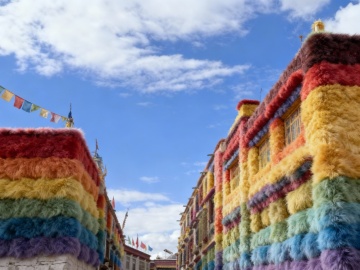 建筑整体呈现出全彩色毛线的风格,毛线有层次感,颜色为彩虹色调。建筑保留原始形状,各个部分都如同被几种颜色柔软的毛衣材质精心包裹