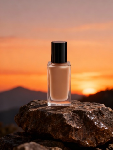 玻璃风3D质感瓶身置于岩石之上,落日余晖映衬出柔和光影,静谧唯美的自然场景中透出优雅时尚气息。