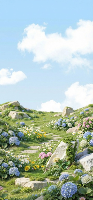 3D渲染风格的自然背景,广阔的绿色起伏草原,草叶茂密且带有细腻纹理,点缀着零星蓝色小花,远处有一棵孤立的小树,上方是明亮的蓝天,漂浮着形态饱满、边缘柔和的白色积云,整体光影明亮柔和,呈现出宁静开阔、充满生机的氛围,色彩以翠绿和蔚蓝为主,过渡自然和谐,画面具有清晰的景深和空间感。