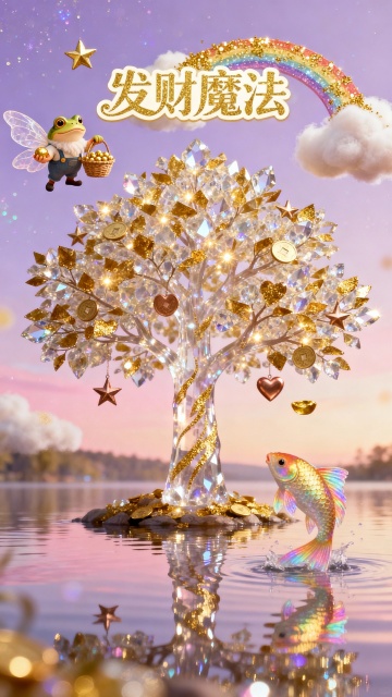 奇幻童话发财插画壁纸,淡紫色渐变底色,会发光的摇钱树(树叶是透明金箔,结出星星形状的铜钱),树下有穿背带裤的小矮人抱着元宝,湖面倒映元宝轮廓,云朵是棉絮状(夹杂金色亮片),‘发财魔法’文字是带金边的童话字体,笔触细腻带珠光质感,画面四周有轻微模糊渐变,主体居中