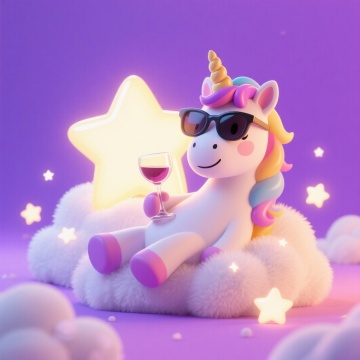 梦幻紫色星空下,软3D风拟人独角兽戴墨镜手持红酒杯,坐于云朵之上,四周点缀发光星星,可爱又俏皮。