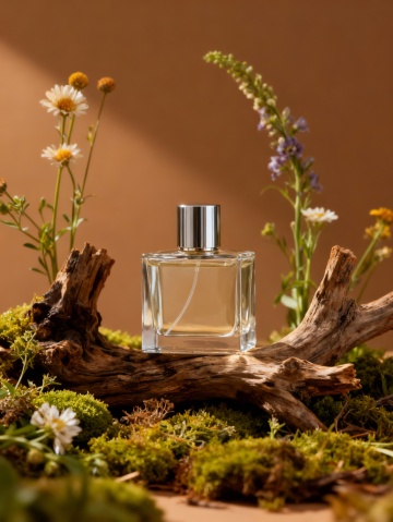 优雅奢华的香水瓶置于木雕风底座,搭配柔和插画风花卉,简约主义设计,尽显高贵。
