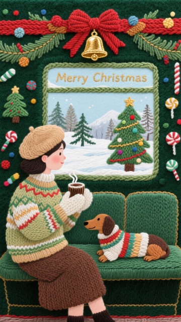 温暖冬日家庭插画,卡通风格搭配针织纹理,轻拟物与扁平风融合,窗景雪景映衬壁炉暖意,传递节日温馨舒适感。
