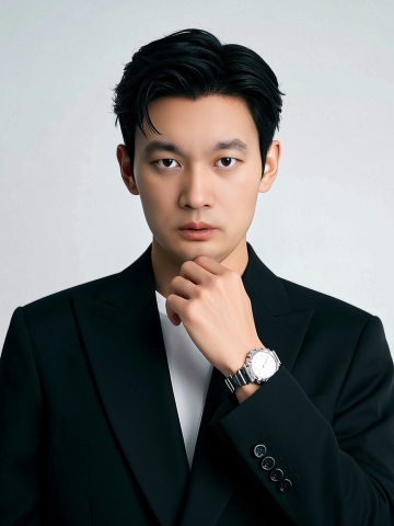 一位年轻亚洲男性,身着剪裁合体的黑色西装,内搭白色衬衫,系着黑色领带,左手自然插在西装裤口袋,右手轻握西装前襟,面带温和微笑,姿态自信挺拔,背景为纯白色,整体呈现清晰、专业、正式的商业人像摄影风格,光线均匀柔和,突出西装的挺括质感与人物的精神面貌。