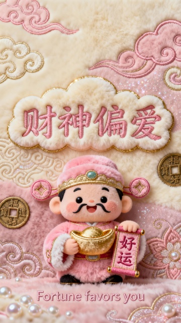 整体构图遵循9:16比例,顶部1/4区域为简洁绒面背景,整体画面国潮好运、温暖、富贵、治愈、绒感高级。暖冬毛绒质感背景,柔软细腻触感,主色为浅粉、奶油粉与珍珠粉渐变,并带有细腻柔焦,高级温柔治愈氛围。背景铺陈精致绣花纹理,包含国潮祥云纹、古典铜钱纹、吉祥如意纹,以粉金丝线刺绣效果呈现,低调浮雕、细腻闪光,不抢主体但提升贵气层次。画面中下区域呈现粉色系小财神,软萌讨喜,袖口带绒面刺绣细节,手持粉金色元宝或写着“好运”的招财卷轴,风格治愈、喜庆但高级不幼稚,采用绒面+手工刺绣质感表现。小财神上方呈现毛绒立体中文大字“财神偏爱”,字体为圆润软糯、云朵书法感,3D绒毛效果,边缘带细微金色高光。画面底部搭配小号英文副标题“Fortune favors you”,字体为简洁优雅无衬线,珍珠粉微光效果。