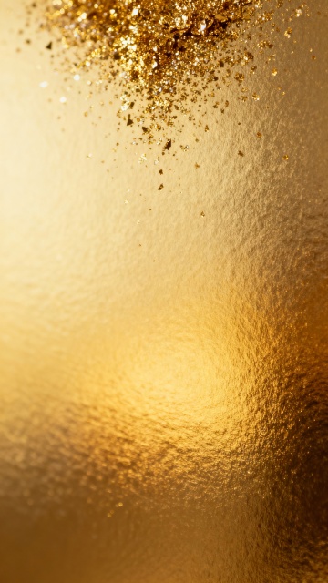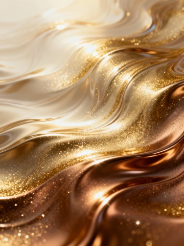 金色鎏金背景,带有细腻的金色闪光和丝滑的质感,呈现出流动的波浪形态,光线从右上角照射,形成明亮的高光和柔和的阴影,整体色调从浅金色到深金色渐变,带有不规则的漩涡状纹理和闪烁的金色微粒,营造出奢华而动感的视觉效果。