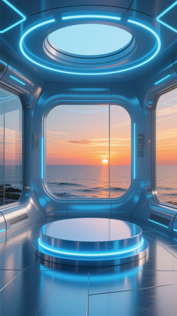 3D渲染风格的科技感简约海报,以深邃的蓝紫色星空为背景,点缀着大小不一、带有细腻纹理的行星和闪烁的星辰,营造出宁静而神秘的宇宙氛围。画面中央是一个悬浮在云海之上的圆形科技平台,平台边缘有发光的灯带,底部与水面相接形成清晰的倒影,平台后方矗立着一个巨大的半透明弧形结构,线条流畅,边缘有蓝色光晕勾勒。远处地平线上,柔和的霞光穿透云层洒向连绵起伏的山脉轮廓,整体色彩以蓝紫渐变为主,光影对比柔和,突出主体元素的科技质感与空间层次感。设计遵循简约美学,视觉层级明确,主体平台和弧形结构为视觉焦点,背景元素简洁不杂乱,确保画面在传达科技感的同时保持整体的简洁与平衡,能快速吸引观者目光并传达出未来感与探索精神。