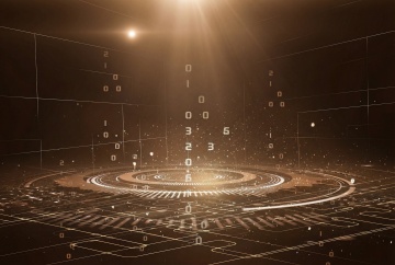 深蓝色背景下的赛博朋克风格3D渲染科技场景,画面顶部布满由0和1组成的二进制数字流,呈现出悬浮的粒子效果,中央有一道明亮的蓝色光束从上方垂直射下,照亮下方由蓝色发光线条构成的电路板纹理地面,地面上布满整齐排列的发光电路纹路和数字代码,整体光影效果具有强烈的纵深感和空间感,光线带有柔和的光晕和渐变,营造出神秘而充满未来感的科技氛围,色调以深蓝和亮蓝为主,色彩和谐统一,画面简洁大气,充满科技感和设计感。