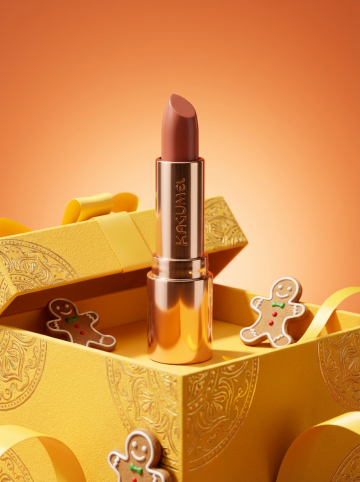 鎏金风3D质感唇膏,置于雕花礼盒中,搭配姜饼人点缀,融合奢华与喜庆,传递节日温馨与时尚可爱感。