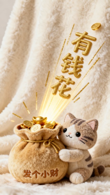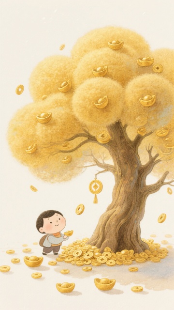 画面中心是一棵枝繁叶茂的摇钱树,每一片椭圆形的叶子都变成了金黄的铜钱,铜钱表面有着细腻的纹理,在秋日暖阳的照耀下,闪烁着柔和的金色光芒,仿佛在微风中轻轻摇曳。摇钱树的枝干旁,立着一个古朴的小木牌,木牌上用流畅的书法字体写着“招财”二字,字体颜色为深褐色,与整体画面的金秋氛围相得益彰。温暖的阳光从画面右上方洒下,为摇钱树和木牌镀上一层金色的光晕,在地面投下淡淡的阴影。浅景深效果明显,摇钱树和木牌清晰可见,背景虚化为一片淡淡的橙黄色,营造出丰收且充满财富感的氛围。
