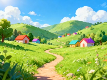 插画风虚拟自然景观,清新舒适,蓝天白云下绿树成荫,营造梦幻田园氛围。
