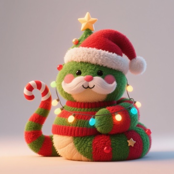 软3D风格的圣诞小蛇,毛茸茸的拟人化设计,头戴圣诞帽,身披彩灯与条纹毛衣,萌趣十足,充满节日喜庆与温馨氛围。
