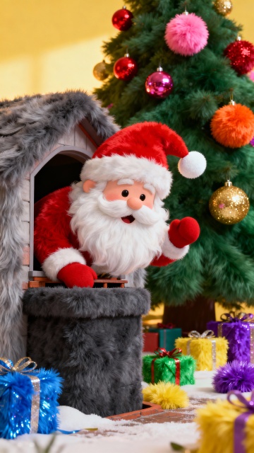 3D卡通风格圣诞场景,毛发生长质感的圣诞老人从屋内烟囱探出头来,搭配面料风礼物与彩球装饰树,营造温馨喜庆氛围。一个圣诞老人从屋内烟囱探出头来的特写,地上散落着色彩缤纷的礼物,背景远处还有一个巨大的圣诞树