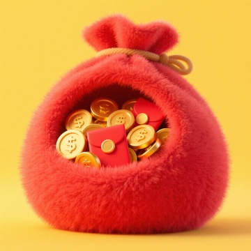 3D重拟物风红金钱袋,鎏金铜钱飞溅,中式纹样雕琢,金属质感闪耀,喜庆奢华尽显春节氛围。