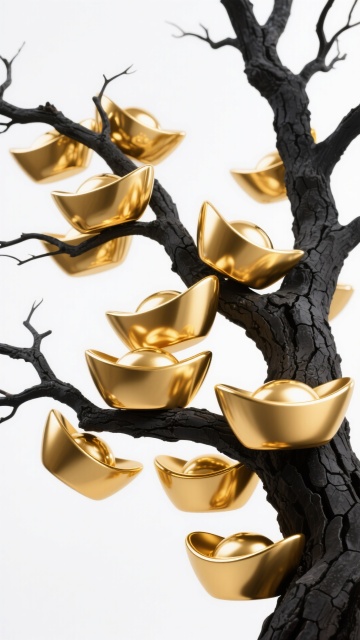 毛绒质感招财树,树枝是浅棕色软毛,叶子是金色毛绒团,枝头挂着小金币、毛绒元宝、红绸带,树下堆着蓬松的 “钱袋”(毛绒材质),背景是淡金色渐变,光斑柔和不刺眼