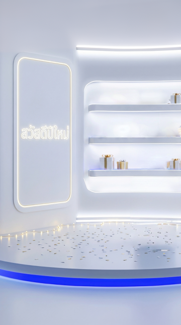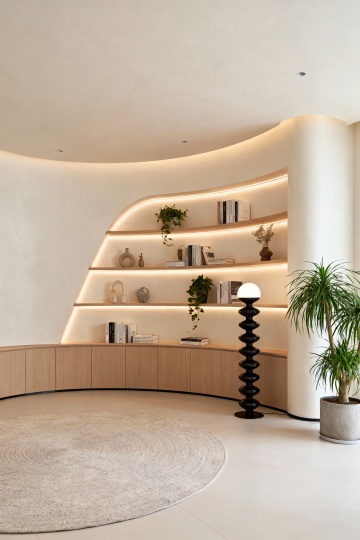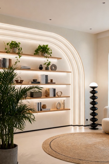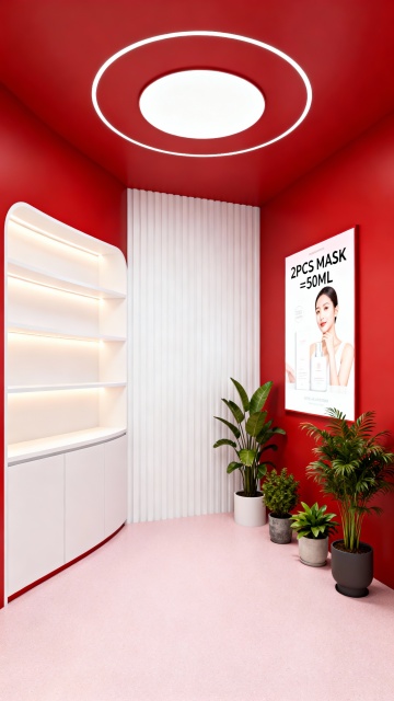 极简主义风格的直播间背景设计,柔和的浅灰色墙面搭配流畅的弧形白色装饰结构,右侧为多层弧形白色展示架,摆放着各种护肤品瓶罐,底部有金色金属包边,左侧是弧形白色柜台,台面下方有嵌入式暖黄色灯带,地面为光滑的浅色大理石材质,整体空间明亮通透,光线柔和均匀,营造出简约、高级、纯净的氛围,无任何文字元素。