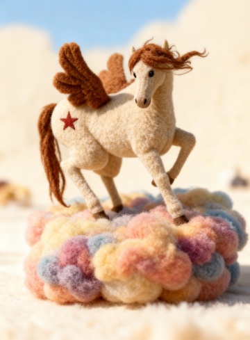 整体毛绒绒质感(1.2)主体小马呈现出飘逸的毛绒质感的风格,毛绒有层次感,毛绒颜色保留原来小马的身体颜色,鬃毛和翅膀为棕色系色调。小马保留原始形状,小马的翅膀可以变得超大超抢眼, 维持毛绒绒的感觉,祥云可以加入更绚丽的颜色同时也变得毛茸茸的看上去就软软的,背景可以更加温暖米白一点,为背景增加一点虚化,放大和突出前景的小马,整体质感接近于摄影大片,绒毛质感可以做出区分