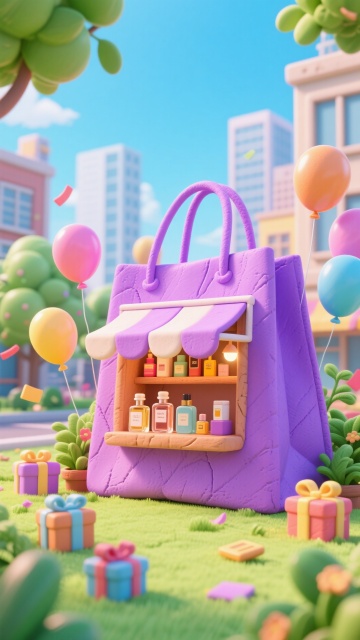 梦幻感与可爱感交织的软3D风格场景,紫色购物袋化身微缩商店,搭配粘土质感与卡通元素,营造超现实主义节日氛围。