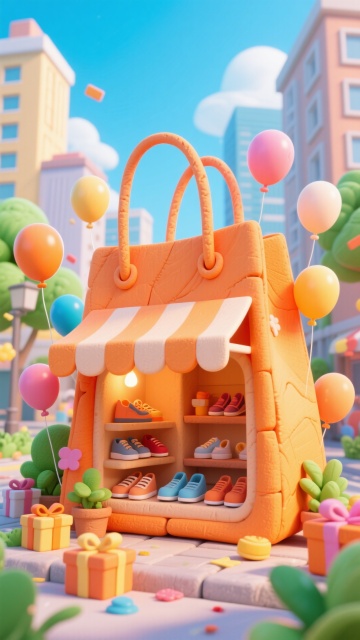 软3D风卡通场景,购物袋化身童趣小店,搭配气球与礼盒,营造梦幻喜庆氛围,充满可爱与趣味感。