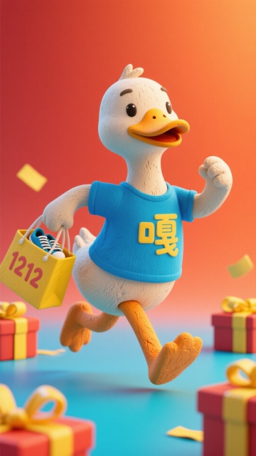 软3D风格的拟人小鸭,身穿印有“嘎”字的蓝色T恤,手提“1212”购物袋,奔跑于礼盒间,充满可爱、卡通与喜庆的促销氛围。