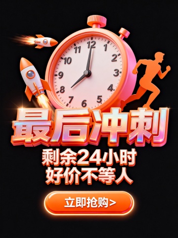 3D重拟物风格,霓虹灯效果点缀,科技感十足的计时器与火箭元素结合,营造酷炫促销氛围,强化紧迫感与抢购冲动。