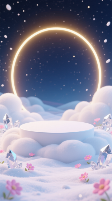 梦幻夜空下,柔和光环悬浮于云海之上,水晶与粉花点缀雪地,3D软渲染营造唯美元素,粒子飘散,玻璃质感透亮,宛如虚拟自然仙境。