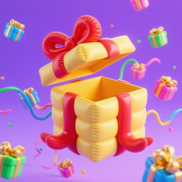 软3D风格的紫色毛毡礼盒,拟人化大眼睛萌趣十足,彩虹丝带跃出箱体,充满卡通感与趣味感,传递节日惊喜。